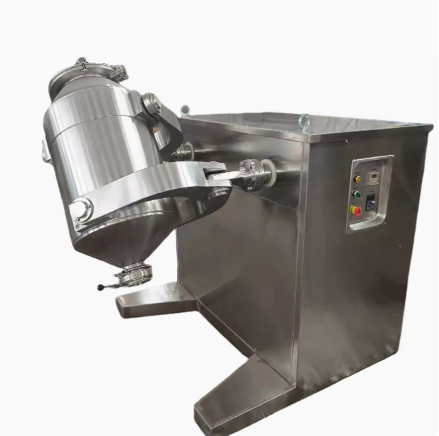 該機(jī)由機(jī)座、調(diào)速電機(jī)、軸、回轉(zhuǎn)連桿及筒體等部分組成。裝料的筒體在主動軸的帶動下作平移動及搖滾等復(fù)合運(yùn)動,促使物料沿著筒體作環(huán)向、徑向和軸向的三向復(fù)合運(yùn)動,從而實(shí)現(xiàn)多種物料的相互流動擴(kuò)散、摻雜,以達(dá)到高均勻度混合的目的。