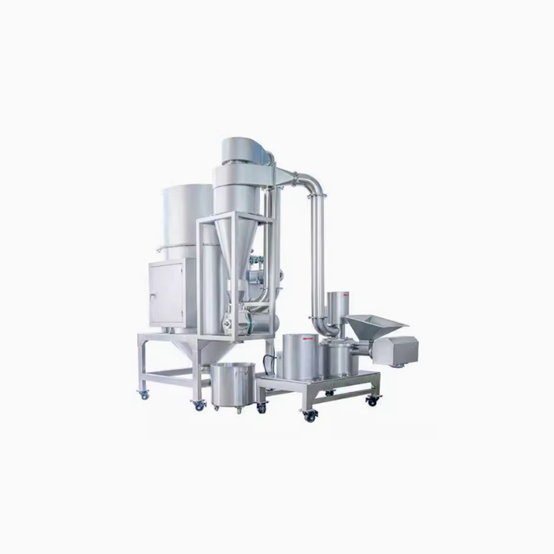 JWF-WZ系列超微粉碎機組是一種立軸反射型微粉碎機。該機由高效粉碎機預先粉碎,細度達到要求的粉磨進入進入二級旋風分離器。粉塵吸進除塵箱、達到要求的物料落人收集倉,未達到細度要求的物料經過一級旋風分離器落入超微粉碎機的加料斗進行超微粉碎。超微粉碎機通過高速旋轉的刀片進行粉碎,高速旋轉的分級葉輪把沒有達到細度要求的物料阻擋在粉碎室繼續粉碎,在不停機的情況下,可任意調節粒度大小。產品粒度均勻,細度可達80-450目,該機具有自冷卻功能。