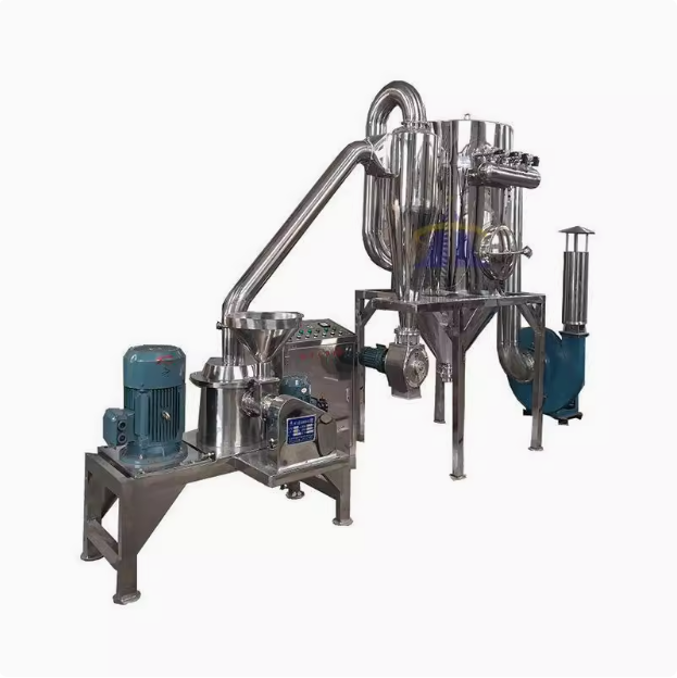 本機由粉碎機、旋風分離器、脈沖除塵箱及風機等幾大部分組成。該機是利用活動齒盤與固定齒盤間的相對運動,使物料經齒盤沖擊、磨擦及物料彼此間沖擊而獲得粉碎;粉碎好的物料經旋轉離心機和風機的引力,進入旋風分離器出料,然后經關風機;粉塵進入脈沖除塵箱,通過過濾筒和回收。整機按“GMP”標準設計,全部用不銹鋼材料制造,生產過程中無粉塵飛揚, 該機有連續出料效果,有效利用了流水線作業,且能提高物料的利用率,降低企業成本,目前已達到國際先進水平。
